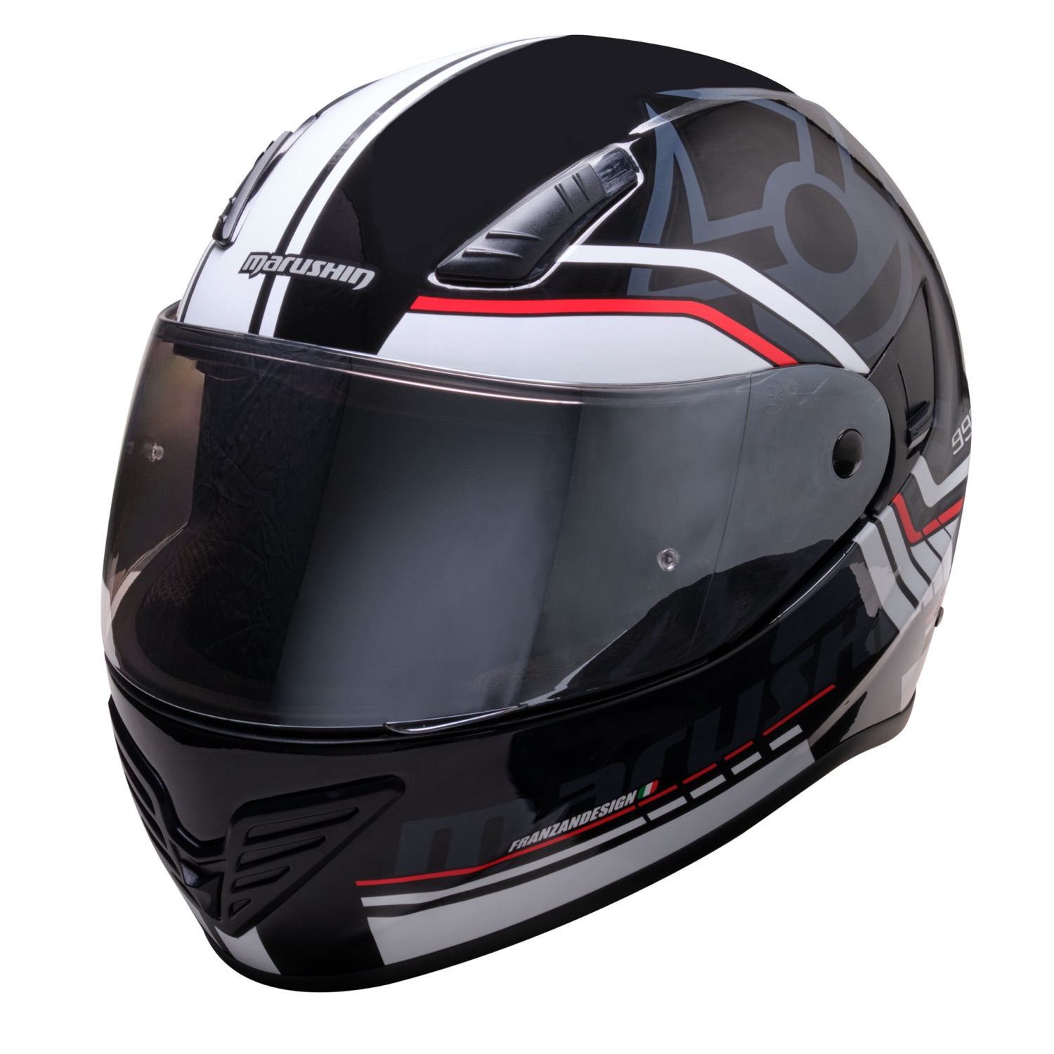 MATERIALI: Vetroresina ottimizzata dal punto di vista aerodinamico e composta da materie prime estremamente leggere e resistenti. VENTILAZIONE: Il nuovo design permette un ricircolo dell'aria ancora maggiore. Tutte le prese aria possono essere attivate e disattivate anche con guanti. INTERNI:Le rifiniture Marushin-Cool regolano la temperatura, assorbono l'umiditˆ ed evitano la proliferazione di batteri e cattivi odori. I guanciali e i cuscinetti centrali possono essere rimossi e lavati. I nuovi guanciali permettono grande confort anche a velocitˆ elevate. Gli interni sono stati disegnati appositamente per permettere l'utilizzo degli occhiali senza incorrere in nessun fastidio. VISIERA: Chiara antigraffio, con sistema Pinlock. Visiera parasole interna, la quale non ha alcun impatto negativo sulla sicurezza grazie all'assorbimento urti EPS. PESO: 1290 gr (+/- 50gr) CHIUSURA: Cinturino con chiusura a crick facilmente regolabile e semplice da utilizzare. OMOLOGAZIONE: ECE 22/05 MISURE: XS - 2XL COLORI: NERO MONOCOLORE + GRAFICHE CARATTERISTICHE: molto leggero, visiera interna parasole, compatto. Facile da usare anche con occhiali. Pronto per intercom