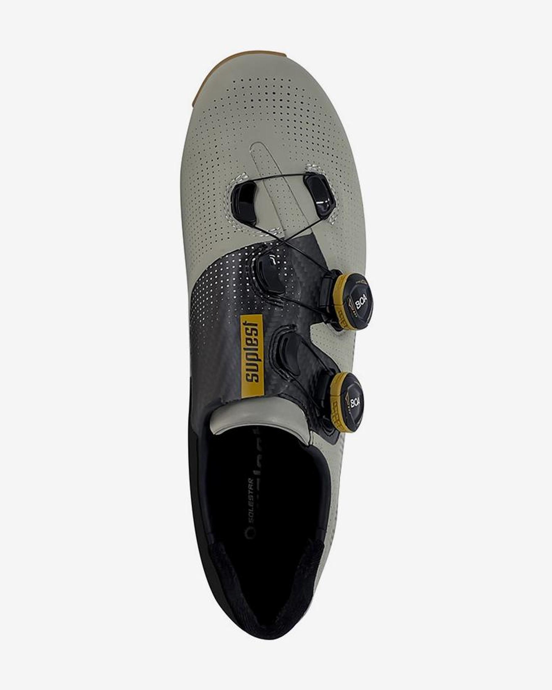 Dettagli Le scarpe Suplest Edge+Road Pro sono caratterizzate da una tomaia in micro fibra saldata a caldo e da una suola rigida in carbonio leggera e rigida con alette SUP traction nell'avampiede e nel tallone per il comfort di camminata e la protezione della suola. La linguetta anatomica WRAP si adatta al piede per una calzata confortevole e incorpora anche un sottile strato di carbonio che assicura la distribuzione della pressione sul collo del piede. Sistema di chiusura mediante 2 quadranti BOA IP-1 che offrono un'incomparabile precisione di regolazione. Soletta Solestar che offre il massimo comfort e la massima stabilità senza perdita di potenza.